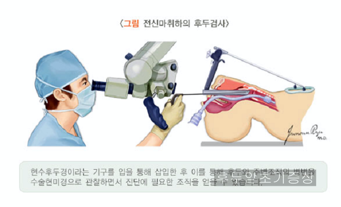 조직검사로 확진 여부를 알 수 있는데, 전신마취 후 현수후두경검사를 받아 수술현미경으로 후드를 확대해 관찰하면서 조직을 채취하는 것이 가장 확실한 방법이라고 해요.