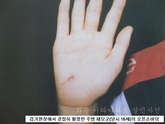 칼을 건네받은 채 군은 이 씨를 찌른 후 욕조물에 엎드린 자세로 넣고 다시 수차례 등허리 쪽을 반복해서 찌르게 되는데 이 때 칼손잡이가 미끄러지면서 손바닥에 창상을 입게 되죠.