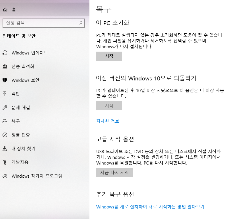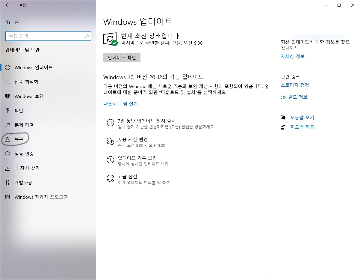 3. 업데이트 및 보안을 누르신다음에 복구탭을 누르세요.