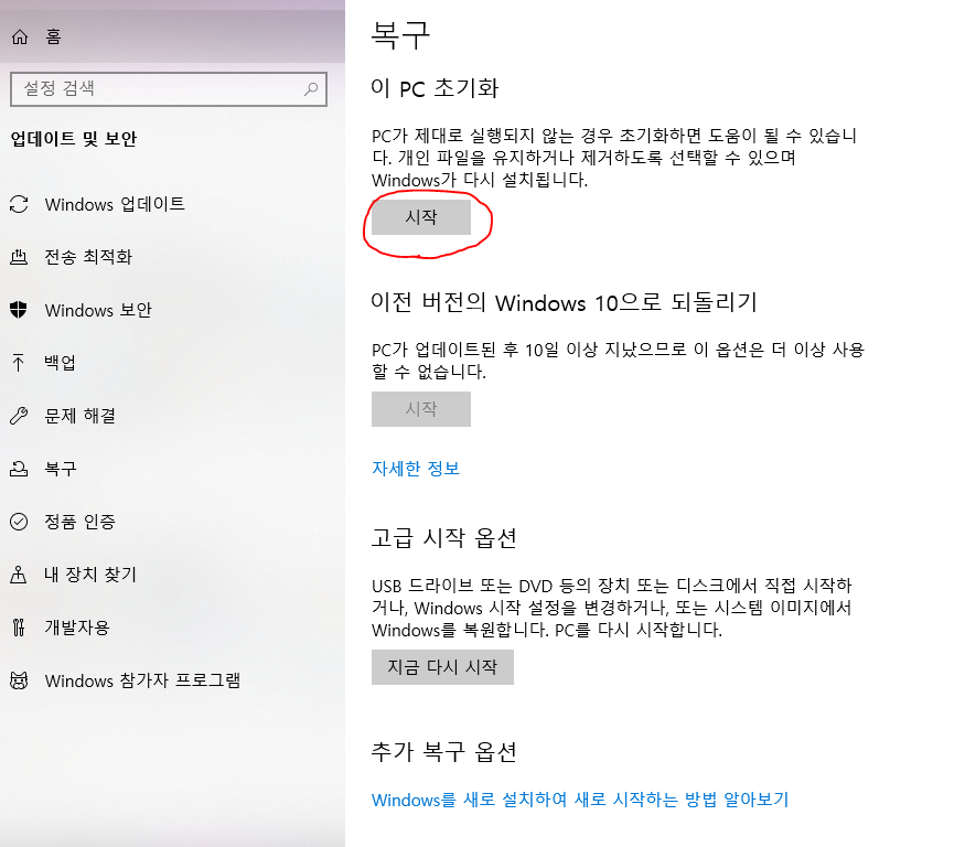 4. 이 pc 초기화 시작버튼을 누르세요.