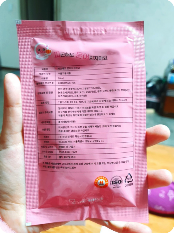 피문어즙은 특유의 비린맛이 난다고 하던데~ 저한테는 전혀 느껴지지 않았어요.