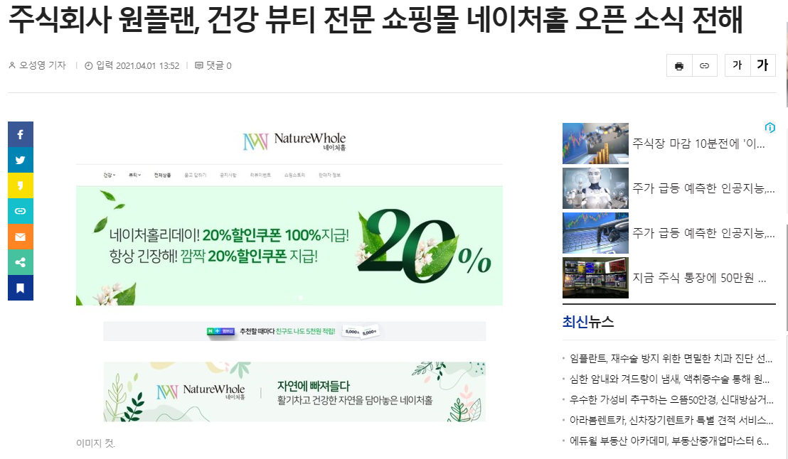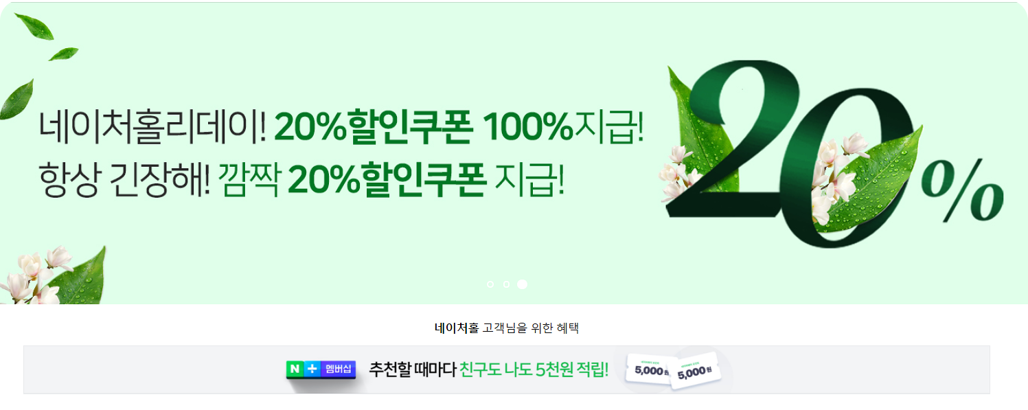 이뿐만아니라 "네이처홀리데이"라고 해서 랜덤으로 정해진 날에 카카오톡플러스친구를 추가하신 분들에게 20%쿠폰이 나간다고 하는데요.
