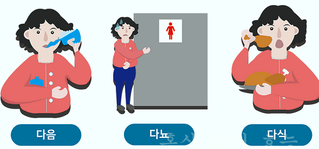 이렇게 당이 흡수되지 못해 혈액속에 당이 넘치게 되고 이를 소변을 통해 자주 배출하다 보면 몸안의 수분이 빠져나가게 되어 갈증이 생기고, 에너지를 제대로 공급바지 못하기 때문에 식욕또한 증가하죠.