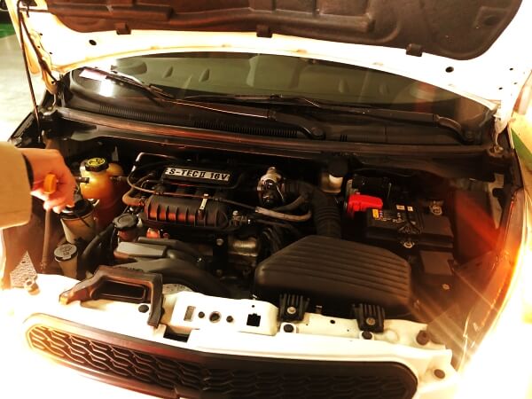 보닛을 열고 엔진 오일의 적량을 확인하고있어요~