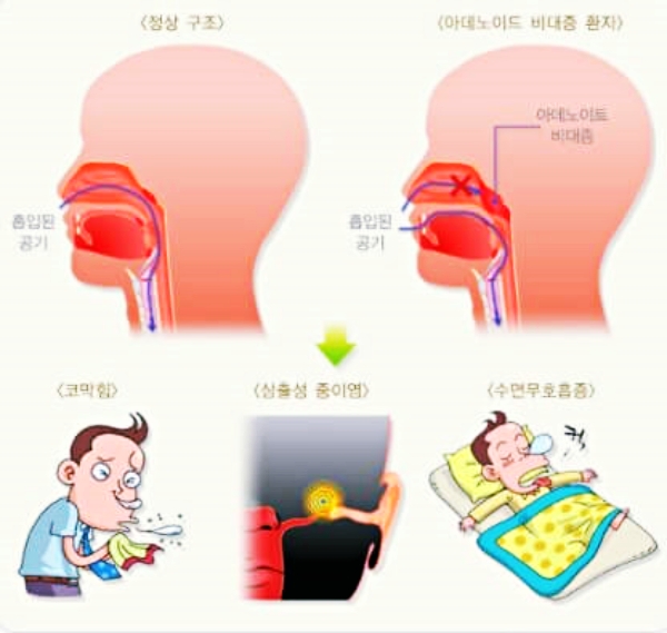 "구조적원인"으로는 편도 아데노이드 비대,코막힘,목젖 주위막힘 등이 있습니다.