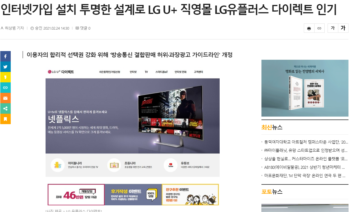 이 곳은 정직함과 투명함으로 앞장서서 '인터넷가입'을 하는곳으로 이처럼 뉴스 기사에도 나올정도니 확실히 신뢰가 갈 수밖에 없더라구요!!