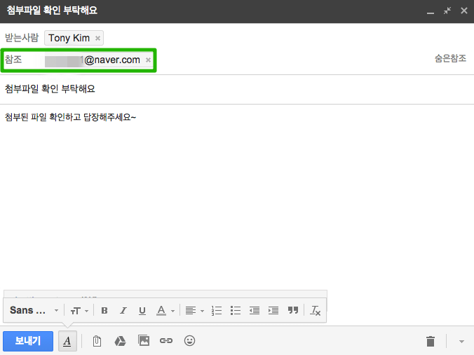카본카피를 의미하는 CC다음에 다른 수신인의 이메일주소를 적으면 그 수신인한테도 똑같은 이메일이 발송됩니다.