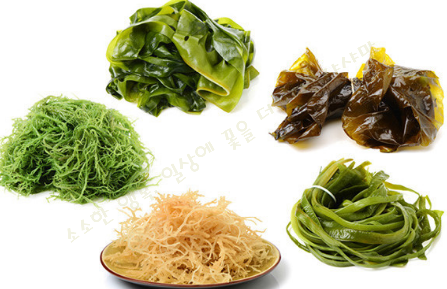 4.해조류- 미역, 김, 다시마와 같은 해조류는 수용성 섬유소로 위와 장을 부드럽게 해주고 혈액을 맑게하여 노폐물, 염증을 배출시키는 역할을하여 도움을 준다.