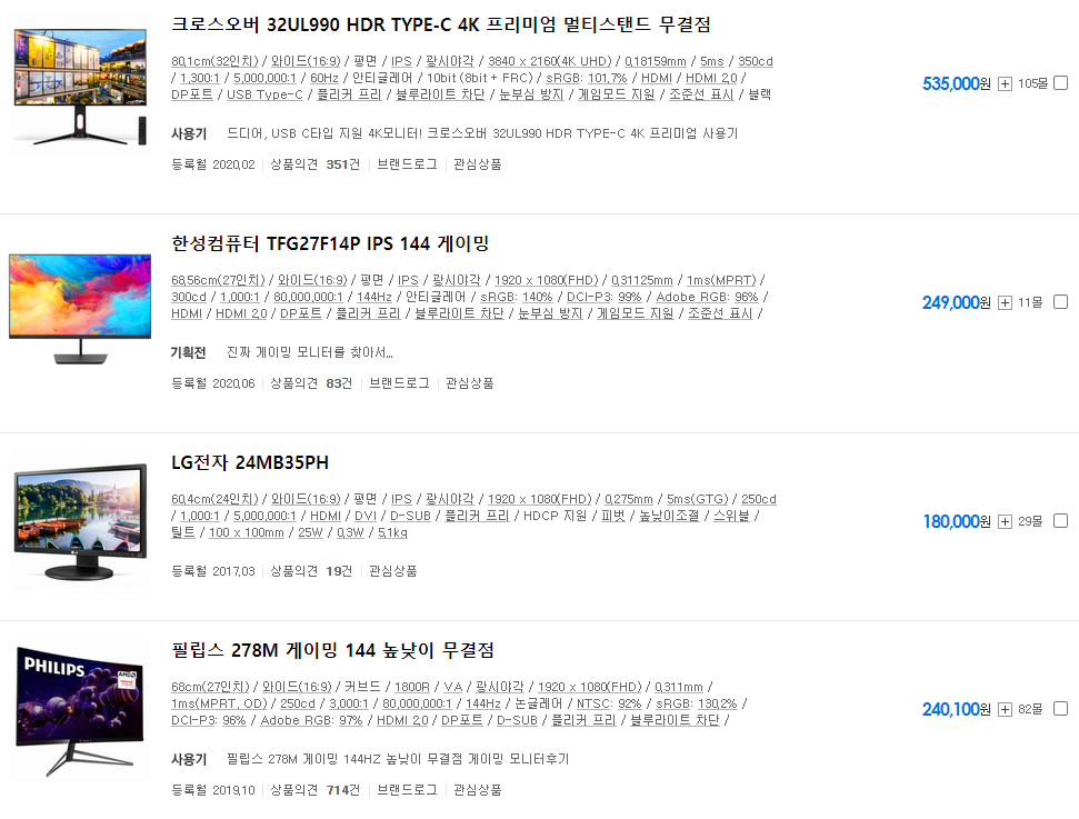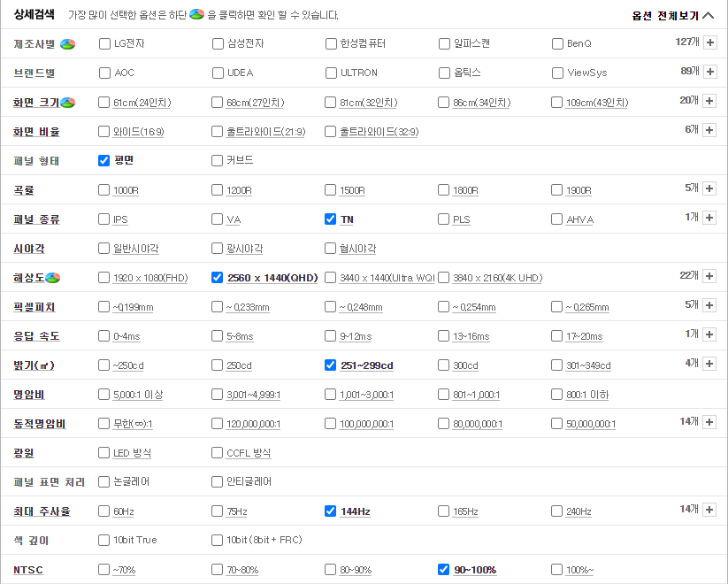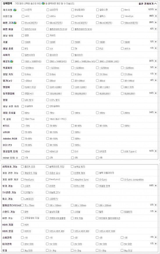 다나와를 들어가셔서 모니터 탭으로 들어가시면 옵션리스트가 있습니다.
