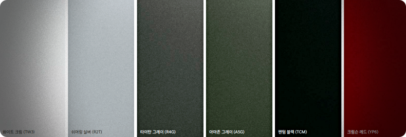 차량 컬처는 6개가 나와있는데 화이트 크림, 쉬머링 실버, 타이탄 그레이, 아마존 그레이, 팬텀 블랙, 크림슨 레드 이렇게 있습니다.