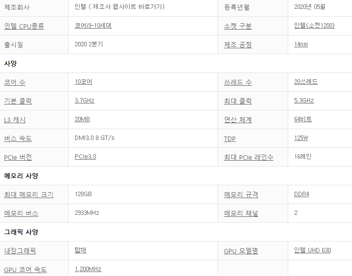 2020년 5월에 처음으로 출시가됏고 소켓은 인텔1200을 사용중입니다.