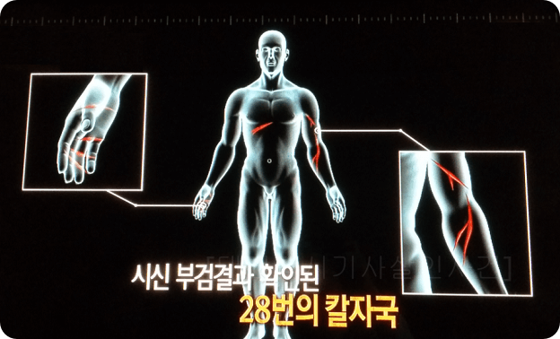 시신의 남은 칼자국은 무려 28곳이나 있었는데, 그 상처들은 특히 얼굴과 머리에 집중이 되어있었습니다.
