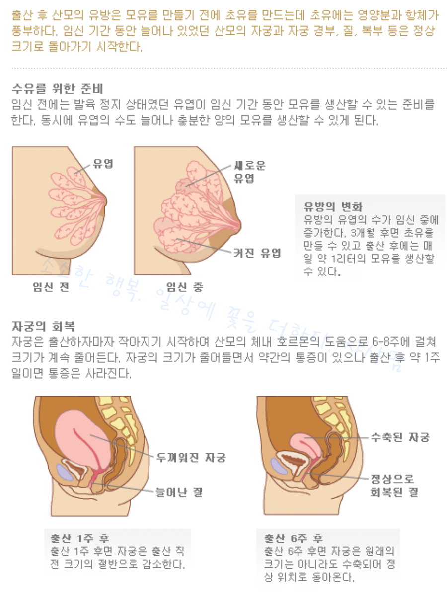 산모는 출산 후에 일어나는 급격한 호르몬의 변화와 신테적 변화에 적응해야 한다.