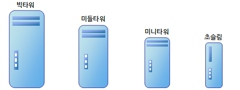 슬림, 빅타워, 미들타워, 미니타워가 있는데 메인보드, 파워, 그래픽카드등을 넣을때 크기가 안맞아서 카드를 밖으로 빼놓고 사용하지마시고 잘 확인하세요!