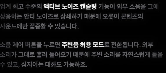 노이즈캔슬링이 좋다고는했지만 다른회사인 소니, 보스, 젠하이저의 노이즈캔슬링을 따라올수는 없을겁니다.